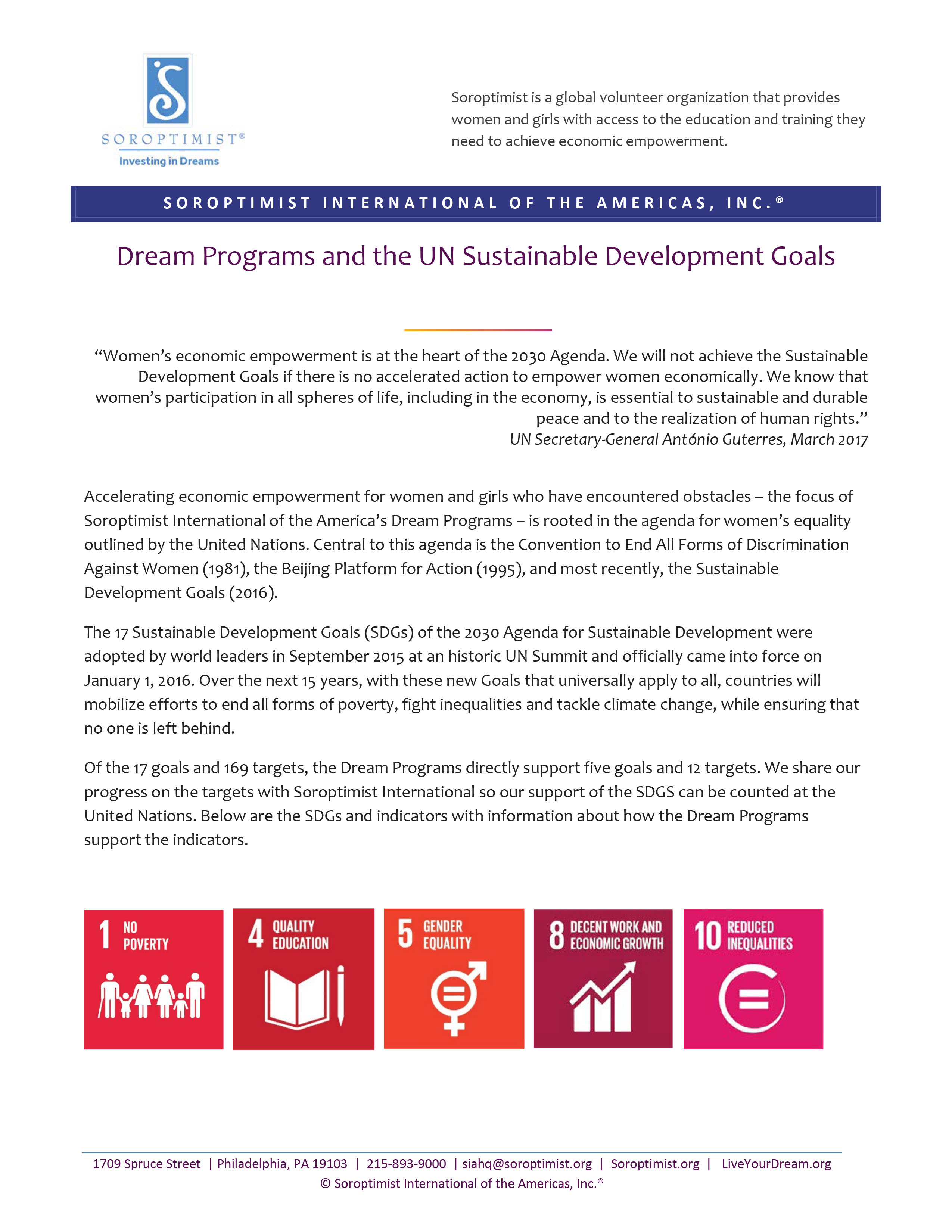 SIA’s Dream Programs directly support many goals and targets of the UN's Sustainable Development Goals (SDGs). We share our progress on the targets with Soroptimist International, which compiles all federations’ support of the SDGs and provides an outcomes and output report to the United Nations.